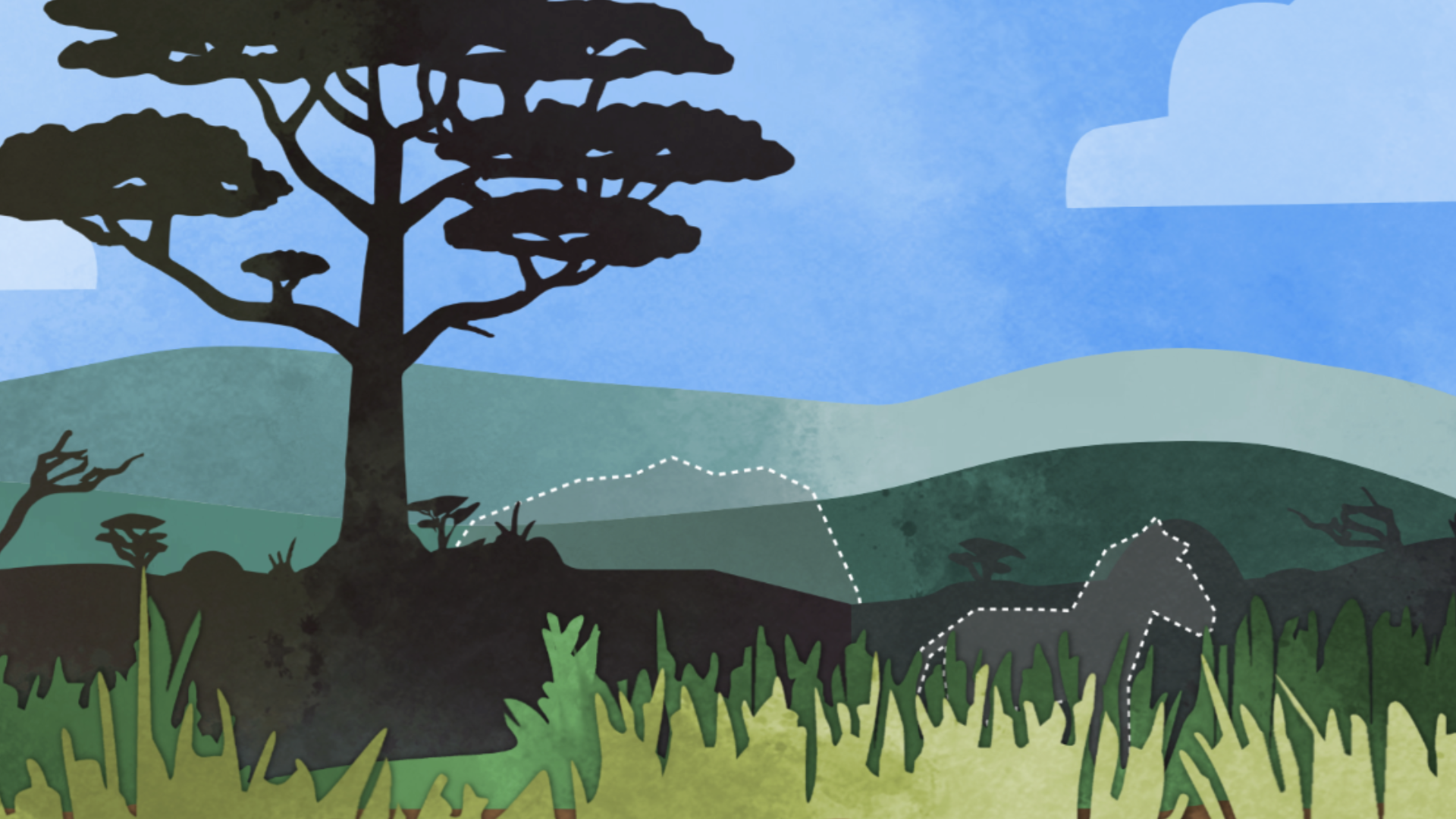Drive through a calm safari landscape and spot animals hiding in the bush.